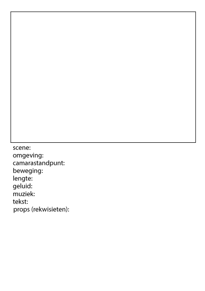 - Elke scene beschrijft de omgeving, camerastandpunt, de beweging, de lengte, de tekst en het geluid weergegeven