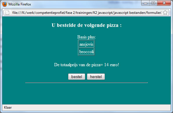 In het volgende html-document wordt aan de bezoeker nog een bevestiging gevraagd voor het wissen van de inhoud van het formulier, wanneer op de knop reset geklikt wordt. Dit wordt geregeld door de eventhandler onReset van het object form. Wanneer op de knop reset geklikt wordt, wordt de functie test() aangeroepen.