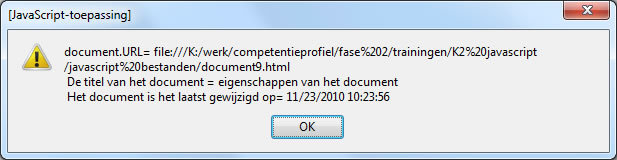 Informatie over het documentDe eigenschappen title, URL en lastModified bevatten informatie over het document. Het script in de volgende listing zorgt ervoor dat deze eigenschappen worden getoond in een venster.
