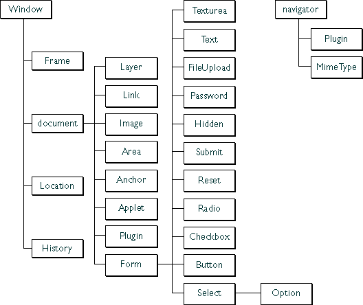 Bovenaan de hiërarchie staat het object window. Met andere woorden: De andere objecten zijn allemaal child-objecten van het parent-object window. Een child-object is eigenlijk een eigenschap van het parent-object. Een child-object kan zelf andere child-objecten hebben. Elk object in de hiërarchie heeft dus eigenschappen of properties die zelf ook weer objecten kunnen zijn. De parent- en child-objecten worden van elkaar gescheiden door een punt: Parent_object.child_object.child_property Bijvoorbeeld: window.history.forward()