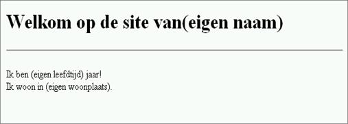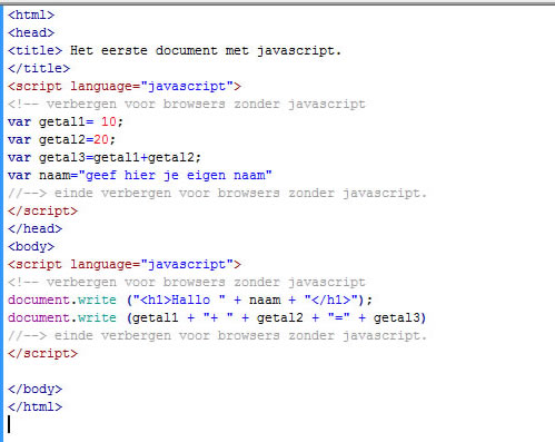 Het grootste deel van de listing is een gewoon html-document. Alleen het deel tussen de tags <script>… </script> is een script. Ook in dit deel zijn html-tags gebuikt voor commentaar. De regel document.write ("dit is JavaScript!"); is in de listing eigenlijk de enige opdracht in JavaScript. Met de opdracht document.write wordt de tekst die er achter tussen haakjes en aanhalingstekens is geplaatst, op het scherm getoond. Elke regel JavaScript wordt een statement genoemd. Een statement binnen een script wordt afgesloten met een puntkomma (;). In de regel voor het einde van het script is een dubbele slash (//) geplaatst. Dit zijn de tekens die je gebruikt om commentaar te geven binnen een JavaScript. De regel achter // is niet zichtbaar voor de bezoeker. Wil je binnen het script meerdere regels commentaar plaatsen, dan gebruik je de codes /* aan het begin van de commentaarregels en de codes */ om het commentaar af te sluiten. Het scheelt een hoop werk, wanneer je het bestand standaard.html, dat je hebt gebruikt in de training html, aanpast voor het gebruik van JavaScript. Oefening: