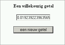De methode random() geeft een willekeurig getal tussen de 0 en de 1. Het gaat altijd om een breukgetal bijvoorbeeld 0.238901. De onderstaande listing plaatst op het scherm een tekstvak en een knop. Wanneer de bezoeker op de knop klikt, verschijnt in het venster een willekeurig getal.