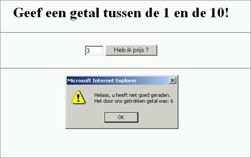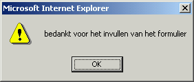 Formulieren controlerenJavaScript wordt veel gebruikt om de invoer van formulieren te controleren voordat de gegevens naar de server worden verzonden. Je ontlast hiermee de server en de bezoeker krijgt direct reactie, wanneer fouten zijn gemaakt bij het invullen van het formulier. In het volgende html-document wordt aan de bezoeker gevraagd om drie tekens in te vullen. De functie controleert de invoer en geeft een melding wanneer meer of minder tekens zijn ingevoerd.