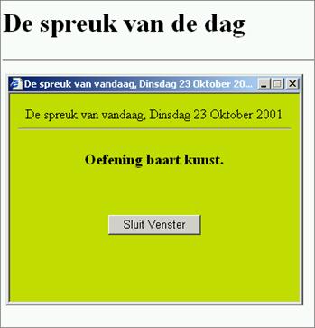 open() en close()Bij de methode open() wordt de inhoud van een venster vrijgegeven om opnieuw beschreven te worden. De methode close() sluit een documentinhoud. In het onderstaande voorbeeld wordt eerst het onderste deel van het script uitgevoerd omdat de functie wissel pas later wordt opgeroepen.