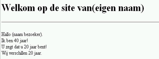 Waarden toekennen met behulp van invoer-schermenJe kunt de waarde van een variabele ook laten toewijzen door de bezoeker van een pagina. Hiervoor moet je zorgen dat een invulvenster verschijnt, waarin de bezoeker een waarde op kan geven. In het onderstaande script zorgt de functie prompt() voor een invoervenster waarin de bezoeker een string in kan typen. De ingevoerde waarde wordt toegekend aan de variabelennaam. De functie heeft twee argumenten. Het eerste argument is de melding die in het venster verschijnt, het tweede argument bepaald de standaardwaarde van het invoerveld. Wanneer een bezoeker niets invult, wordt de standaardwaarde aan de variabele toegekend.