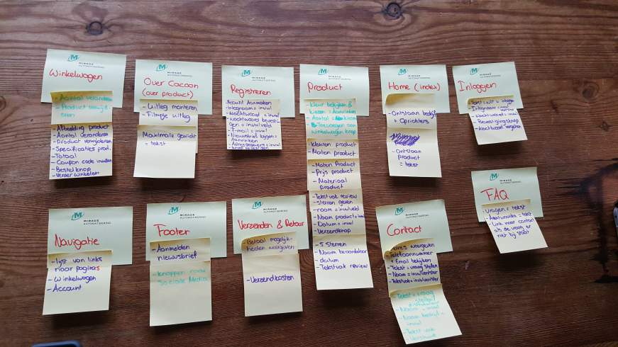 Je vraagt de testpersonen om een zgn. cardsorting uit te voeren. Hierbij laat je de testpersonen de post-its bekijken en plaatsen onder een te bepalen kopje/pagina. Alle user story's komen op deze manier aan bod en je ontdekt dat de testpersonen misschien onderdelen missen, onderdelen overbodig vinden of onderdelen op een andere plaats willen dan jij in gedachte had. Deze feedback noteer je zodat je deze kunt verwerken. Je maakt een foto van de uiteindelijke cardsorting van alle testpersonen (totaal twee foto's).