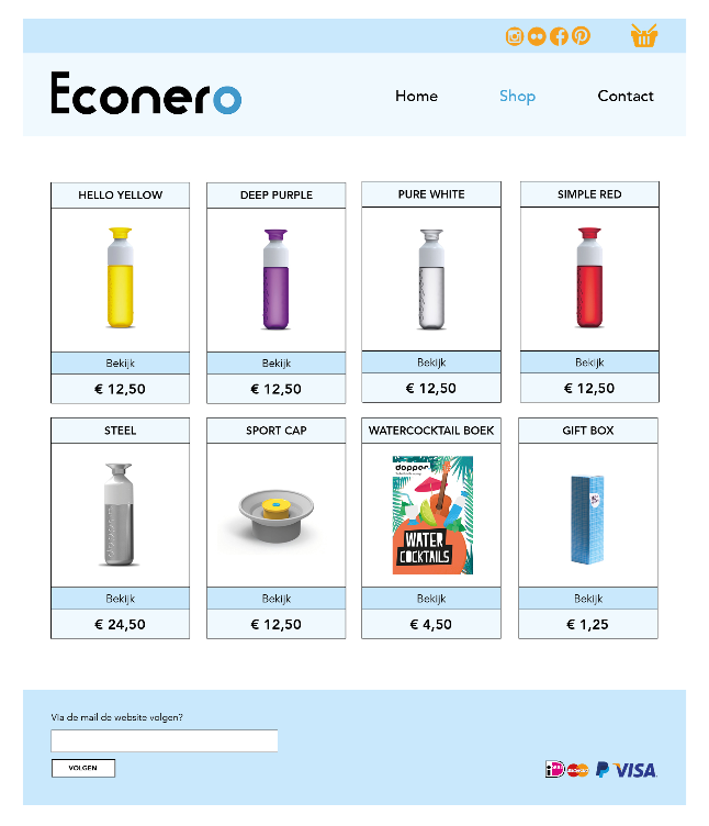 Het visuele ontwerp bestaat uit voorbeelden van alle unieke pagina's: productoverzicht, productpagina, winkelmandje, inloggen/registreren, betaling, bevestiging, over ons, etc. Je maakt een mini-webshop met 12 producten. Als je ervoor kiest om bijvoorbeeld 6 producten op de productoverzichtspagina te plaatsen dan heb je 2 productoverzichtspagina's. Je hoeft dan maar één productpagina uit te werken want deze zien er hetzelfde uit. Je visuele ontwerp maak je in Photoshop.